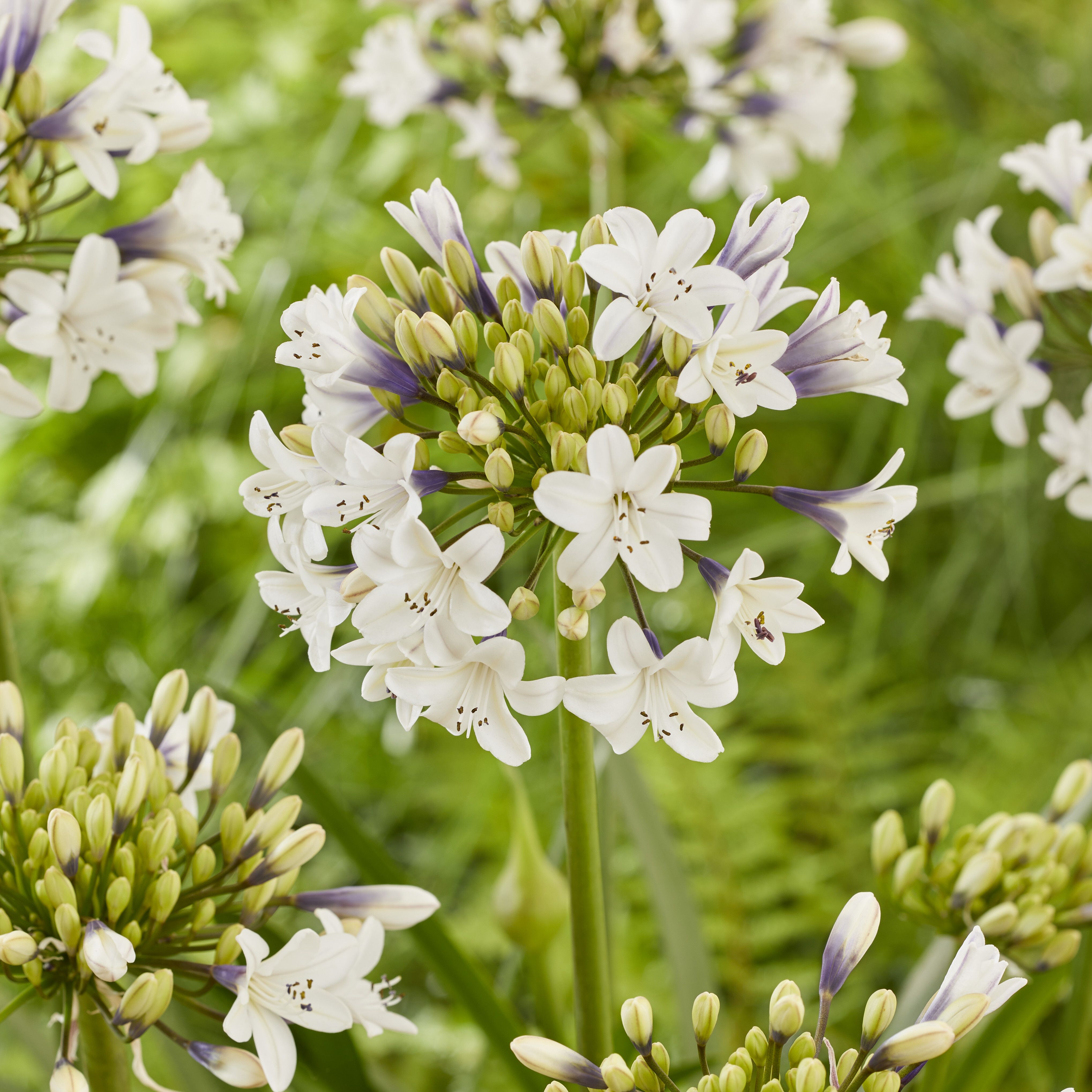 Immergiti in un mondo scintillante con Agapanthus 'Sparkle', una vera e propria meraviglia per il giardino e il terrazzo. I suoi fiori bicolore partono viola-lilla alla base e sfumano al bianco candido. I fiori, raggruppati in infiorescenze sferiche, sembrano scintille che danzano alla luce del sole.