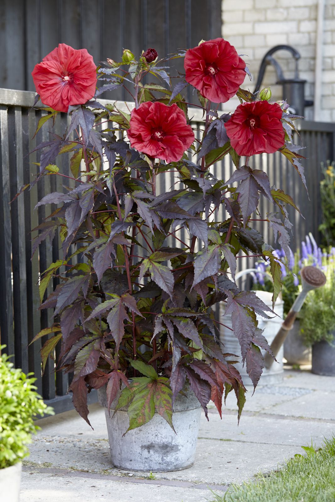 La serie Hibiscus Carousel® è caratterizzata da un portamento cespuglioso, e da foglie profondamente incise e scure, dalla facilità di manutenzione e dalla ricca fioritura con fiori giganteschi. Il diametro del fiore arriva fino a 15-18 cm! "Red Wine" ha fiori veramente grandi, rossi, con un effetto scenografico strabiliante.